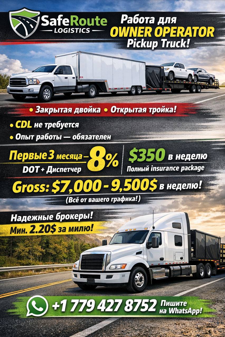 Компания SafeRoute Logistics предлагает сотрудничество с owner operator pickup truck!