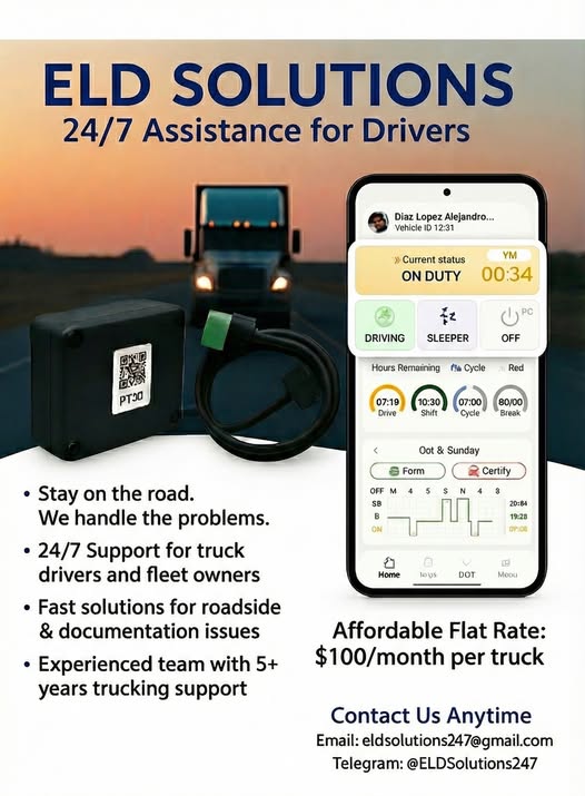 We provide 24/7 ELD and compliance support for truck drivers and fleet owners, helping you stay compliant while focusing on driving. Our team offers: Fast roadside and logbook assistance 24/7 customer support Transparent and secure billing Reliable...