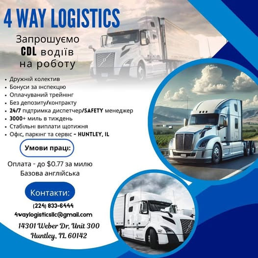 ЗАПРОШУЄМО CDL ВОДІЇВ на роботу Дружній колектив 4 way logistics llc - https://4waylogisticsllc. com/ Бонуси за інспекцію Оплачуваний тренінг Без депозиту/контракту 2/7 підтримка диспетчер/safety /менеджер 3000+ миль в тиждень Стабільні виплати щотижня Офіс, паркінг та сервіс - Huntley, IL Умови праці: Оплата - до $0. 77 за милю Базова англійська Контакти: (224) 833-6444 4waylogisticsllc@gmail. com 14301 Weber Dr, Unit 300 Huntley, IL 60142 4WayLogistics llc web site - https://4waylogisticsllc. com/